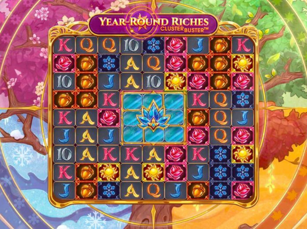 Year Round Riches เป็นเกมที่เล่นบนตารางเกมขนาดใหญ่ที่มี 9 วงล้อและ 9 แถวตรงกลางตาราง คุณจะเห็นตาราง 3x3 หรือ Clusterbuster ซึ่งมีดอกบัวอยู่ข้างในและเปิดใช้งานคุณสมบัติโบนัสบางอย่าง นั่นหมายความว่ามีสัญลักษณ์ 91 ตัวในแต่ละรอบการหมุนดังที่เราได้กล่าวไปแล้ว ตารางแบ่งออกเป็น 4 ส่วนที่แตกต่างกัน โดยแต่ละส่วนจะแสดงถึงฤดูกาลที่แตกต่างกัน